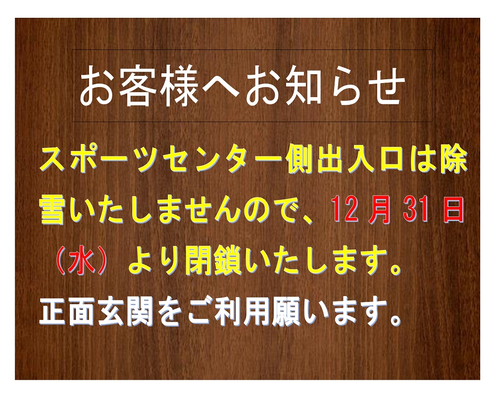 スポーツセンター側出入口、明日31日(水)より閉鎖します。