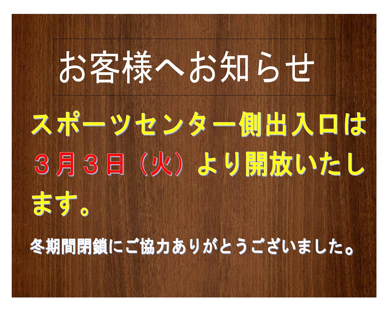 スポーツセンター側出入口3日(火)より開放いたします。