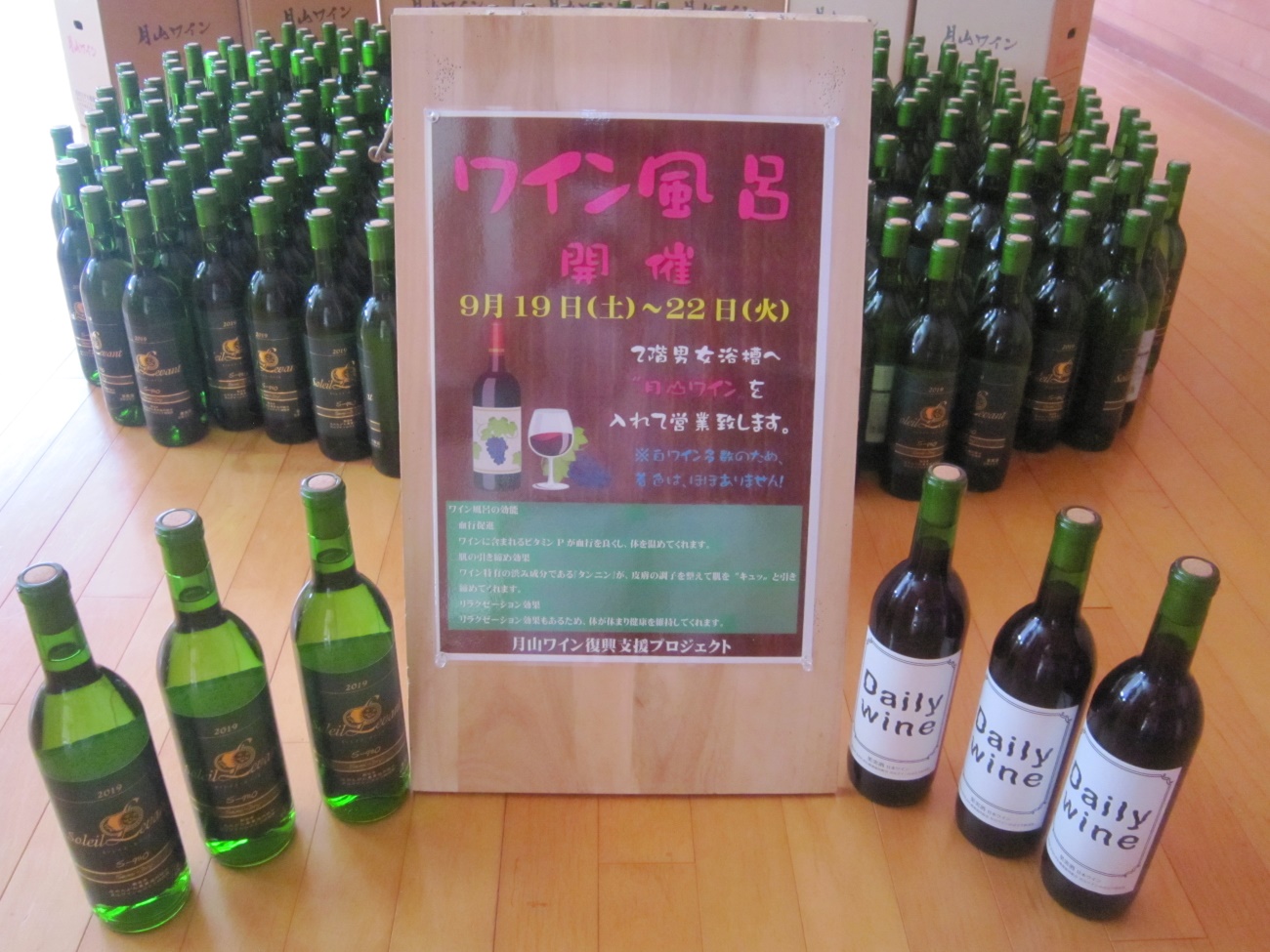 7月28日の豪雨により、月山ワイン貯蔵庫が浸水し、大量のワインが廃棄されることになりました。廃棄ワインの一部を飲用以外に有効活用して「ワイン風呂」を開設し、月山ワインへの関心度向上と、温泉の賑わいづくりに取り組みます。